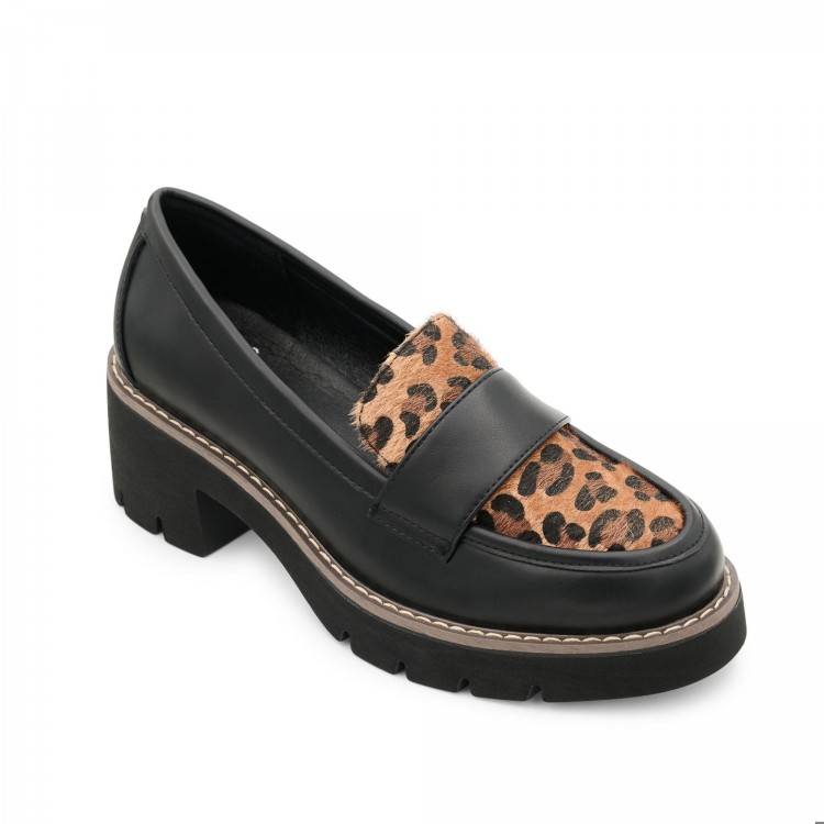 Ανατομικό Παπούτσι Γυναικείο με animal print λεπτομέρειες. Μοντέρνα και κομψά ανατομικά loafers που συνδυάζουν κλασικά στοιχεία με σύγχρονες λεπτομέρειες.Το πιο εντυπωσιακό χαρακτηριστικό τους είναι το animal print μοτίβο στο πάνω μέρος, το οποίο είναι από υλικό που μοιάζει με τρίχωμα. Η σόλα είναι τύπου “tractor”, με βαθιές αυλακώσεις, προσφέροντας όχι μόνο ύψος αλλά και ένα πιο δυναμικό στυλ. Η σόλα έχει επίσης μια ραφή σε ανοιχτόχρωμο τόνο γύρω από τη βάση, προσθέτοντας μια ακόμα λεπτομέρεια. Μαύρο με μαύρο λεοπάρ μοτίβο: Μια πιο διακριτική και ιδιαίτερη επιλογή. Μαύρο με κλασικό λεοπάρ μοτίβο: Μια πιο διαχρονική επιλογή. Ύψος τακουνιού: 5,5cm.
